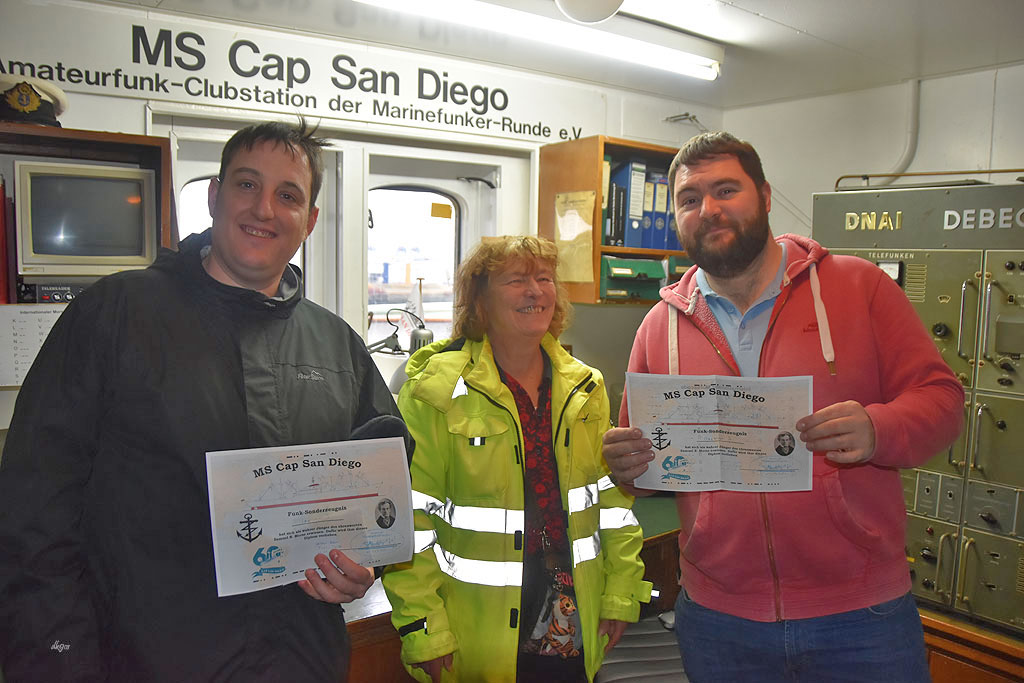 Our Martin, vice Chairman of the RNARS, was also on board. The 1st chairman Ian MØLIH was also in Hamburg. They had arranged with Maren DK9MOS to see a bit of Hamburg together. The first thing they wanted to do was to visit the Cap San Diego. Maren met the two of them together with Ian's girlfriend Vic (Victoria) at the Überseebrücke and then went on board together. First they visited the DLØMFH radio station, which is both an MF and an RNARS club station (MF900/RN4772). Ian MØLIH, RNARS chairman, and Martin MØEHL, vice chairman, demonstrated their Morse code skills and received their personal Morse code diplomas from the CSD. This was followed by a visit to the engine room and an on-board exhibition. At the end of the day, the group had coffee together in the "Heimathafen" restaurant. Afterwards we said our goodbyes with best wishes for the future in Hamburg and a successful service on board the HMS QE. Maren said goodbye to our English friends until the next meeting on the bands or at the AGM.