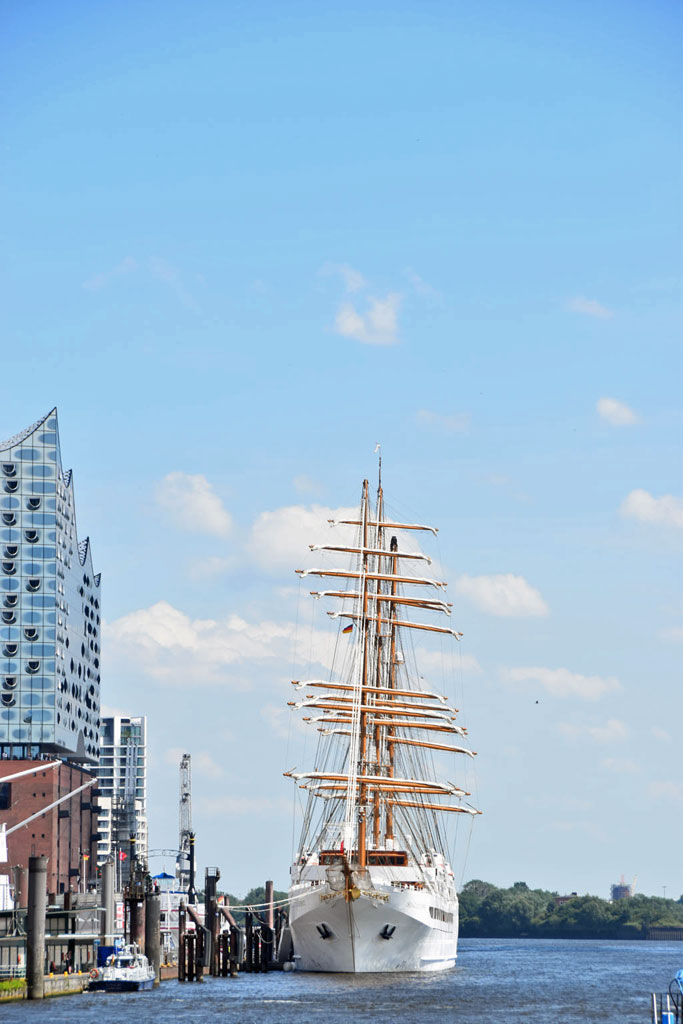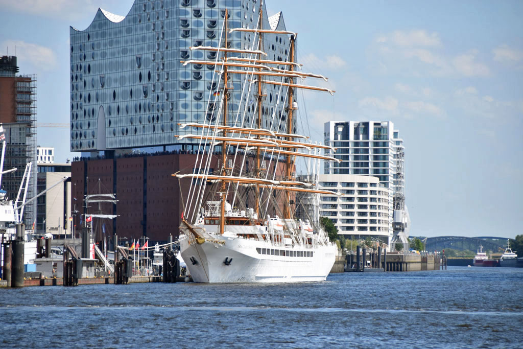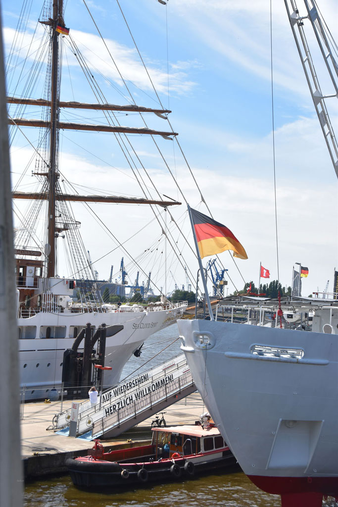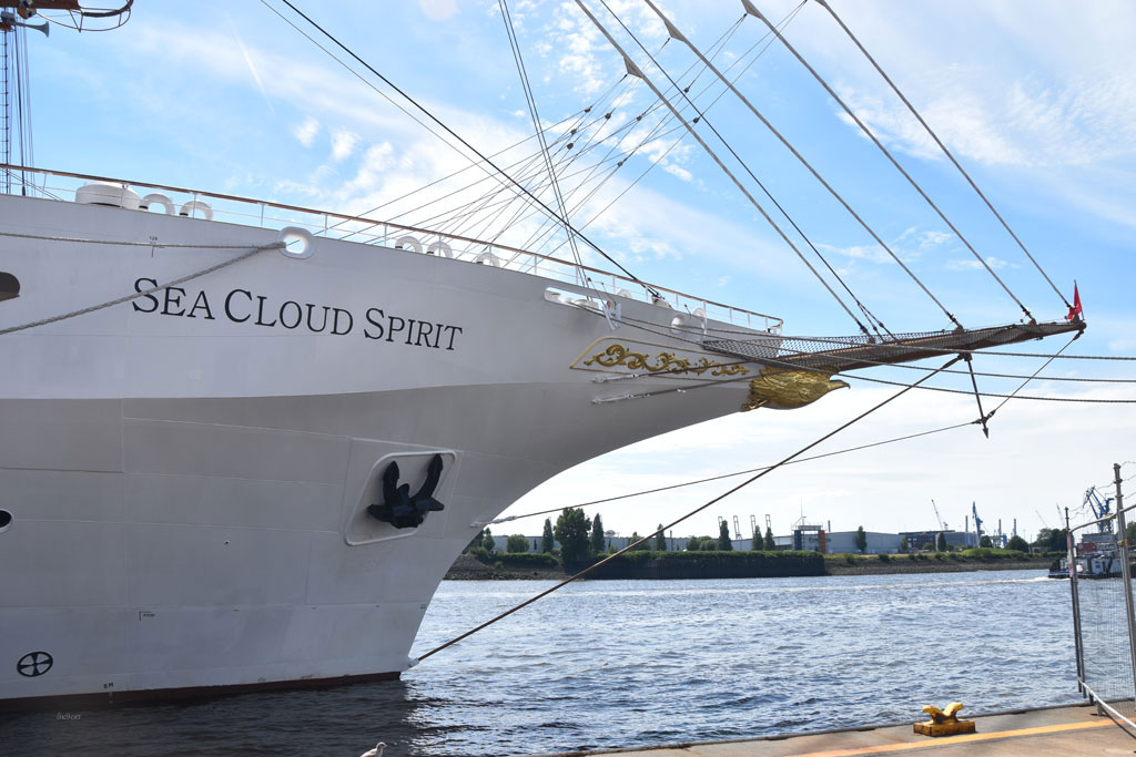 SS "Sea Cloud Spirit" while meeting the MF-flagship MV "Cap San Diego" (DLØMFH), in the port of Hamburg on July 9, 2024.